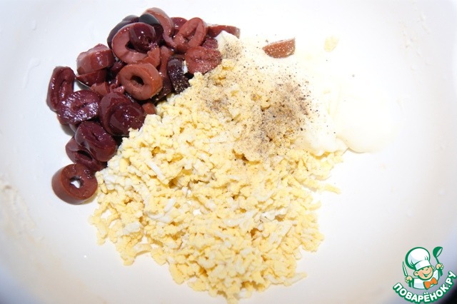 1 яйцо потереть на терку, добавить 2 ст. л. нарезанных маслин, чесночный порошок и 40 гр. майонеза. Перемешать.