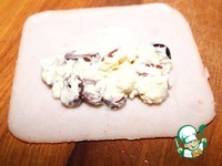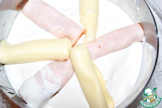 Выстелить кусок ветчины и поместить на него начинку. Скрутить рулетиком. Точно так же поступить с остальной ветчиной и сыром. Всего получается 3 рулета с ветчиной и 3 рулета с сыром.