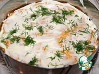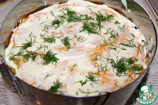 Накрыть морковным коржом и слегка придавить ладошками сверху. Намазать 30 г майонеза и посыпать укропом.