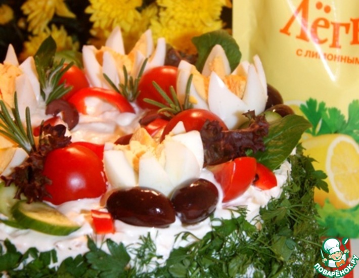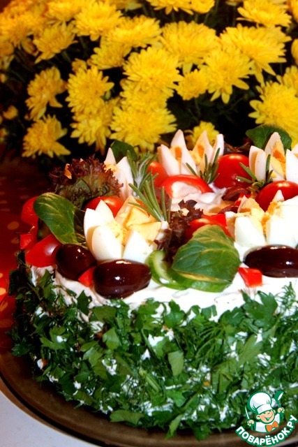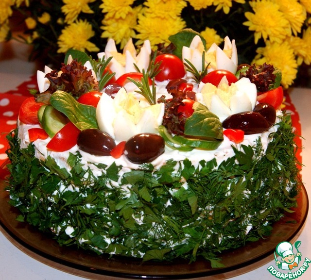 Бока украсить нарезанной зеленью. Верх оставшимися 3 шт. вареными яйцами, маслинами, листочками шпината или мяты и овощами. Поместить в холодильник.
