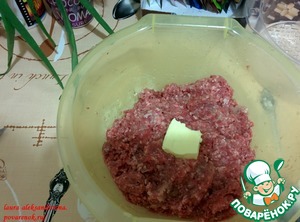 Размораживаем/крутим говяжий фарш (лучше конечно добавить в него свинины, если есть такая возможность). Добавляем перемолотые 2 небольших головки репчатого лука. Солим, перчим, добавляем приправы (я добавляла орегано и специально для говядины). Вбиваем 2 яйца: 1 яйцо полностью, от 2-ого только желток. Смешиваем.