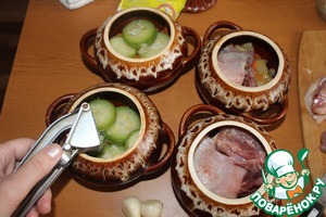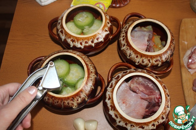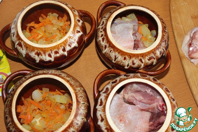 Укладываем в горшочки слоями, сначала обжаренные лук и морковь, сверху в 2 горшочка я положила кружочки молодого кабачка, а в другие 2 горшочка куски курицы. Посолить, поперчить.