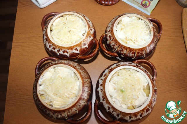 Уложить сверху плотно картофель нарезанный кубиком, посолить, поперчить, намазать майонезом и уложить сверху тертый сыр. Залить водички примерно на 1\3 горшка.