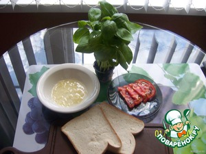 Приготовим греночки или тостики, не знаю как назвать правильно. Чеснок пропустить через пресс и смешать с маслом. Помидор порезать ломтиками.