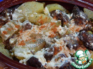 По прошествии указанного времени, заливаем жаркое соусом, посыпаем паприкой и снова ставим в духовку еще на 10 минут.