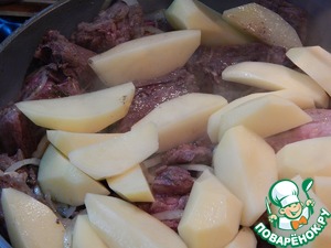 Добавляем нарезанный вдоль на четвертинки картофель.