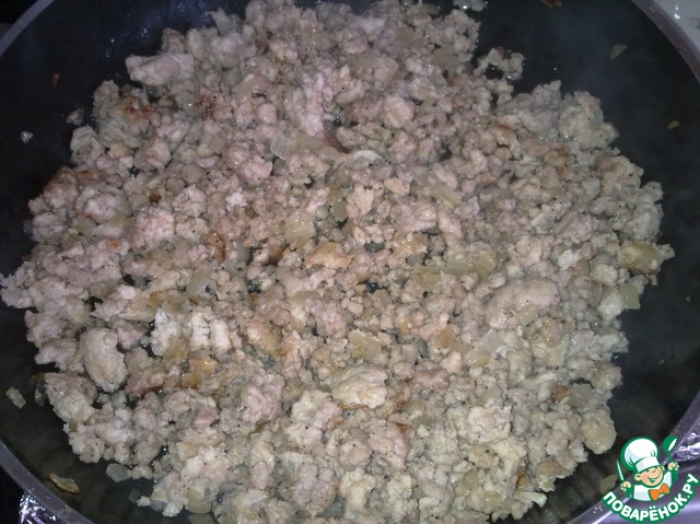 К обжаренному луку добавляем куриный и свиной фарш, минуты за 3 до готовности фарш посолить и поперчить по вкусу.