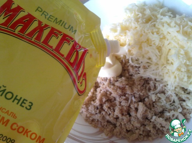 Сыр натереть на мелкой терке. Добавить в фарш сыр и майонез с лимонным соком ТМ "Махеевъ". Хорошо перемешать.