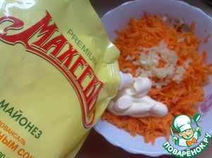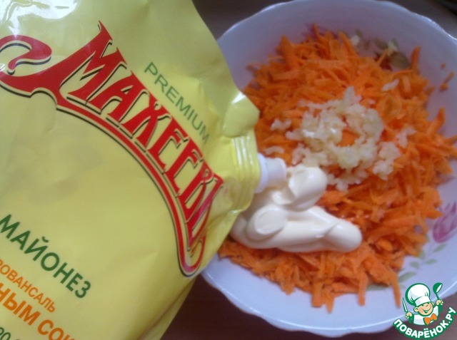 Морковь натереть на крупной терке. Чеснок выдавить через пресс. Добавить майонез и все перемешать.