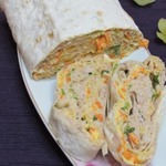 Сверху положить еще один пласт лаваша, промазать оставшимся фаршем и морковью с майонезом. Свернуть рулет и оставить на 30 минут для пропитки.