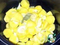 ( К этому времени пюре картофельное было уже приготовлено. ) Картофель очистила, разрезала пополам и положила в мультиварку варить. Налила воду так, чтобы картофель был покрыт. Положила лук, чеснок для аромата будущего пюре и насыпала соль. В конце варки добавила в картофель лавровый листик.