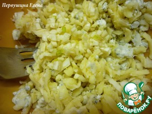 Пока блины жарятся ( не прозевайте их!), сделать начинку из тертого на терке сыра, измельченного чеснока,