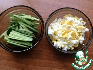 Огурцы нарезать соломкой, в отдельную тарелку измельчить яйца