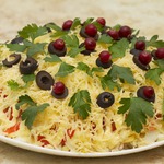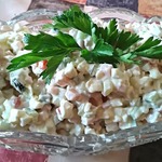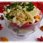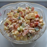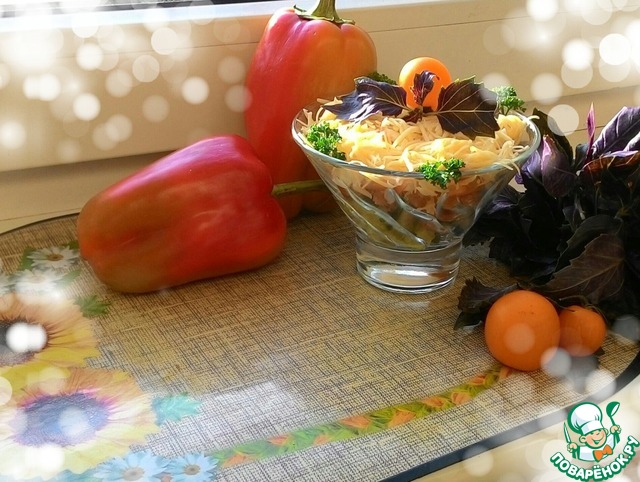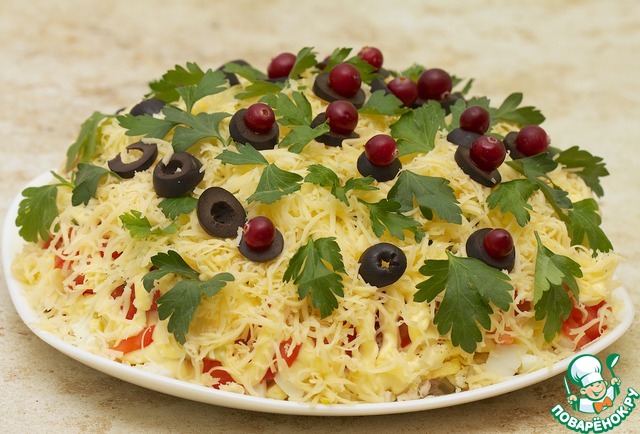 Нежный, вкусный салат. Готовится быстро из доступных продуктов. Приятно украсит праздничный и повседневный стол.