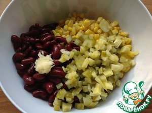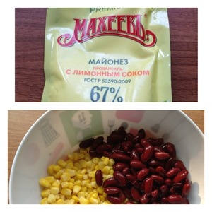 Открыть банки с фасолью и кукурузой, слить лишнюю жидкость и выложить в салатник.
