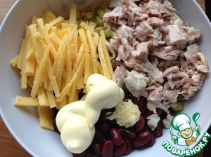 Сыр нарезать соломкой, куриное филе кубиками. Добавить майонез и перемешать.