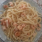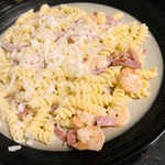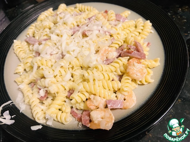 Макароны с креветками и ветчиной в сливочно-чесночном соусе