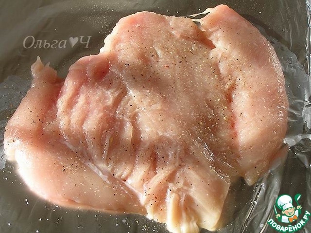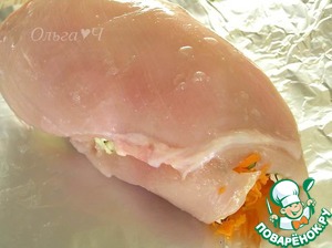 Куриное филе разрезать вдоль, развернуть "книжечкой", слегка отбить, посолить, поперчить, вложить на лист фольги.