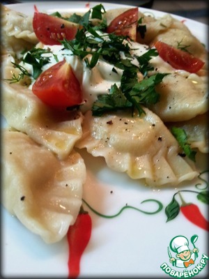 ... и вуаля). Готовые вареники выкладываем на блюдо, поливаем растопленным сливочным маслом, сметаной, посыпаем зеленью и приглашаем к столу.
