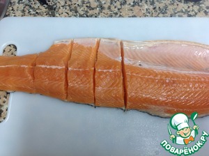 С Филе лосося снять кожу и порезать порционными кусками. Посолить и поперчить.