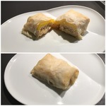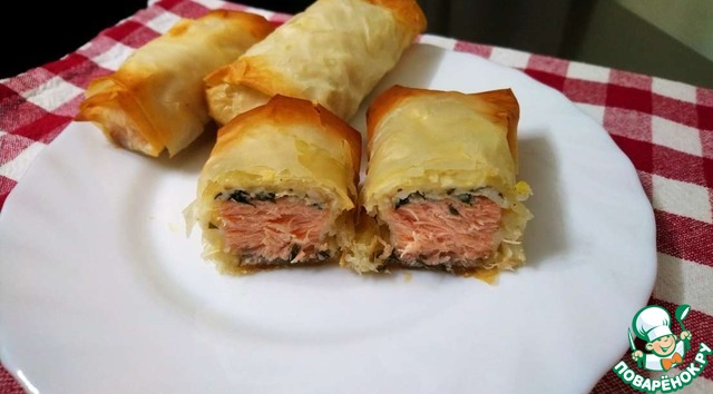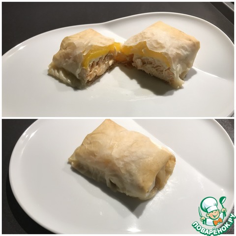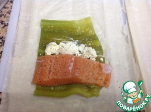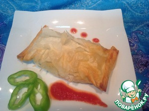 филе лосося положить на перец, добавить немного сыра и Завернуть в тесто фило.