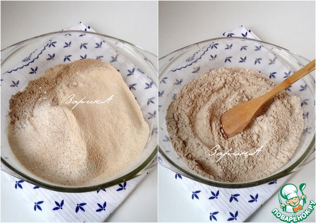 В чаше смешать льняную муку, гречневую муку и пшеничную обойную муку.