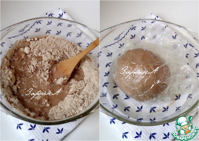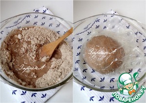 Постепенно добавить воду, столько, что бы получилось мягкое и эластичное тесто. Завернуть тесто в пленку и отставить "отдохнуть".