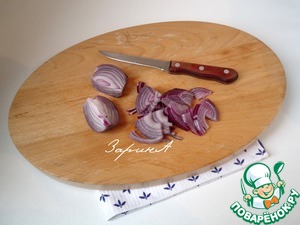 Тем временем займемся сельдью. Лук очистить и нарезать соломкой.