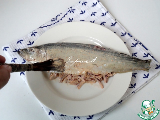 Нашпиговать брюшко луком в специях и майонезе. Поверхность сельди смазать оставшимся в чаше майонезом.