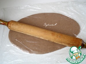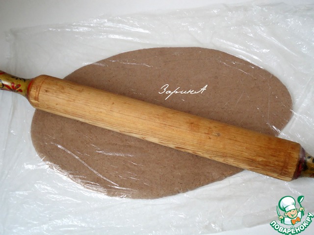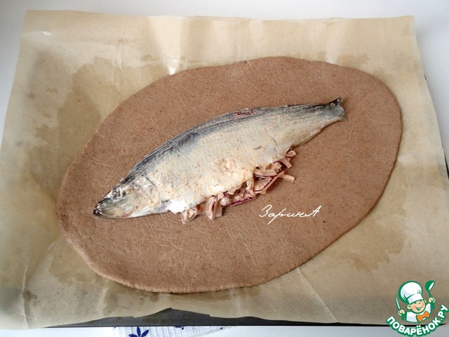Тесто раскатать между двумя слоями пленки в продолговатый пласт, размером чуть больше длины рыбы.