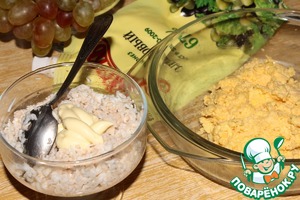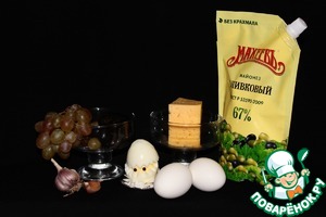 Яйца сварить вкрутую, оливки консервированные без косточек, если оливки и виноград с косточками, то их необходимо удалить. Примечание: мандарина на фото нет, решила провести эксперимент в ходе готовки. Перефотографировать не удалось, поскольку некоторые ингредиенты были использованы полностью. Но результат нам очень понравился, потому делюсь с ВАМИ с удовольствием.