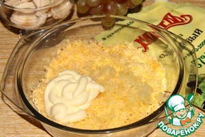 Белки можно оставить какие есть, но я их минут 15 подержала в маринаде от оливок. Они немного поменяли цвет и вкус, который на мой взгляд, стал даже лучше. Тем временем на средней терке трем сыр, яичный желток, давим головку чеснока на чеснокодавке. Добавляем к ним майонез "Махеевъ" столько, чтобы масса была густой и держала форму, но ни в коем случае не жидкой.