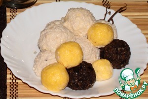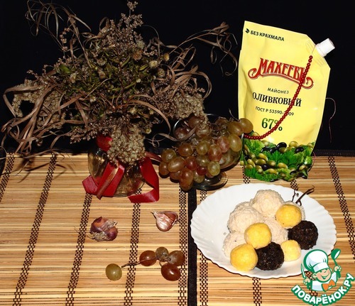 Белки трем также на средней терке и добавляем количество майонеза "Махеевъ". Масса также должна держать форму. Можно и упростить рецепт и белки соединить с основной массой (это экономит время). Сформировать одинаковые шарики, но с разными начинками, даже выложить их в одно блюдо, но я бы так не советовала, но не настаиваю ;))). Поэтому я делаю цветовые различия.