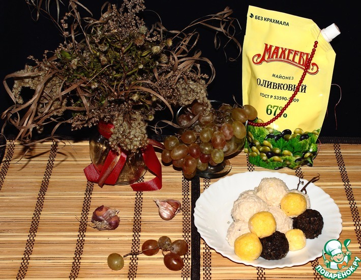 Темные "ягодки": можно облепить оливку аналогично винограду, а можно (как у меня на фото) натереть оливки на средней терке и обвалять в них шарик из сырной массы. Выкладываем наши "ягодки" в виде виноградной лозы.