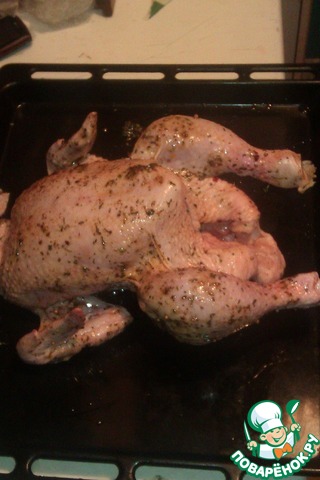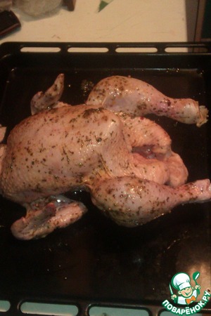 Натираем тщательно курицу, и оставляем на час мариноваться. 2 ч. л. маринада должны быть внутри курицы и хорошо смазана.
