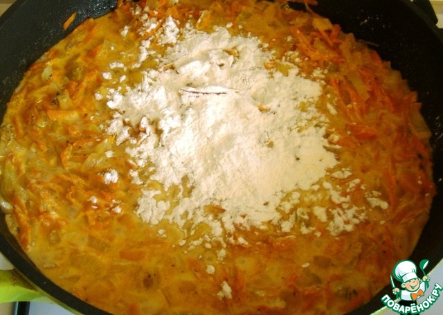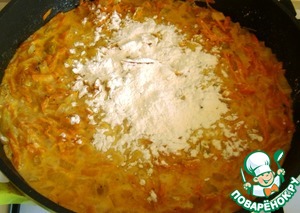 Вводим 1 ст. л. муки и хорошо перемешиваем. Тушим 3 минутки наш соус.