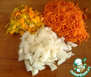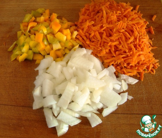 Приготовим соус: нарежем кубиками лук и перец, морковь трем на крупной терке.