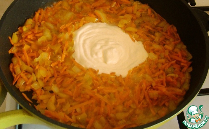 Припускаем овощи на сковороде с небольшим количеством растительного масла. На это уйдет порядка 5 минут. Добавляем сметану и 150 грамм воды. Перемешиваем.