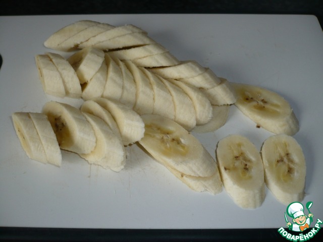 Спелые бананы, но не перезрелые, почистить и порезать косо на кружочки.