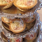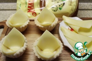 Ломтики сыра разрезала на две части и выложила ими дно тарталеток, оставшиеся два кусочка свернула кулечком.