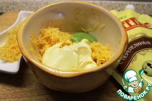 Приготовила сырный соус: в натертый сыр (немного отложила) добавила майонез "Махеевъ" с перепелиным яйцом, оливковое масло, васаби (будьте осторожны, острая штучка), немного подсолила.