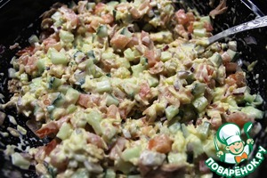 Огурцы и помидоры нарезала мелкими кубиками, лук мелко порубила, сыр натерла на средней терке.