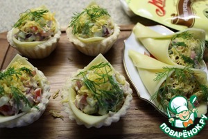 Заполнила получившиеся формочки и кулечки салатом, сверху посыпала отложенным сыром, украсила укропом. Вот и готово, можно угощаться.
