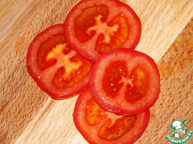 Смазать майонезом и тертым чесноком. Выложить кружочки перца, лука и помидоры. В середину немного рубленной зелени