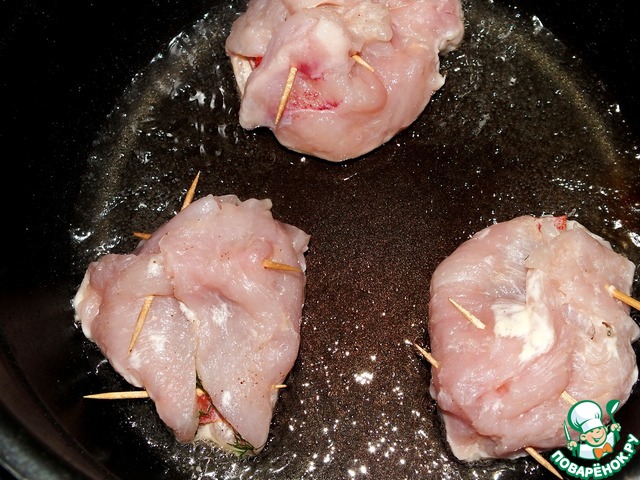 Аккуратно подтянуть края мяса, заколоть зубочистками