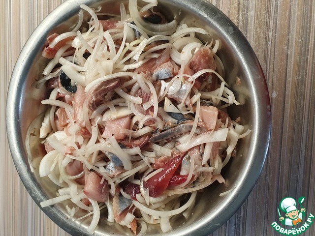6. Укладываем в емкость лук, затем сельдь и затем поверху оставшийся лук.