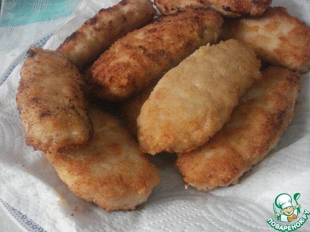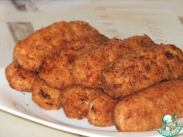 Формируем колбаски, панируя их в сухарях и прокатывая ладонью, чтобы получить ровную продолговатую форму. Если позволяет время, отправьте мазурики на 15 минут в морозилку, чтобы они лучше держали форму.