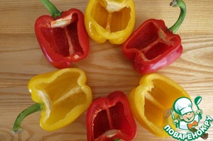 • Первым делом подготовим перец. Срезаем боковую часть, чтобы осталась вторая половина с хвостиком и очистим его от семян.