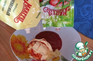 • Готовим соус. Берём майонез, кетчуп, чеснок пропускаем через чеснокодавку, всё смешиваем и добавляем около стакана воды. Пробуем, при необходимости, солим.