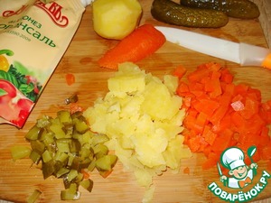 Картофель, морковь отварить, почистить, нарезать кубиками. Маринованный огурец тоже нарезать кубиками.
